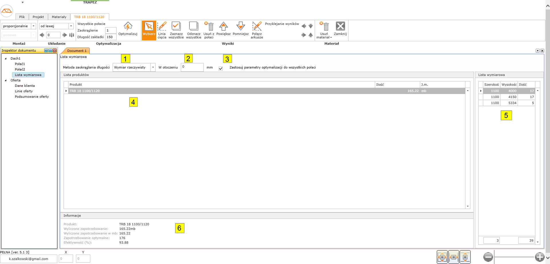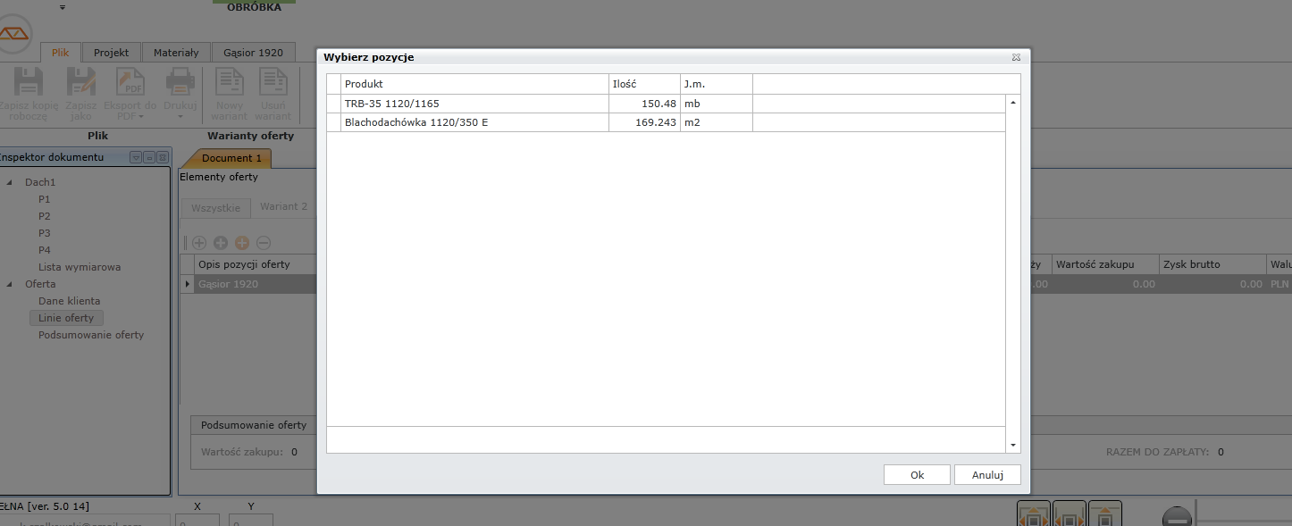 Aby zobaczyć pełną listę wymiarową dla wybranych do oferty pokryć należy wybrać inspektorze dokumentu opcję "Lista wymiarowa". Opcje dostępne na tej zakładce:
