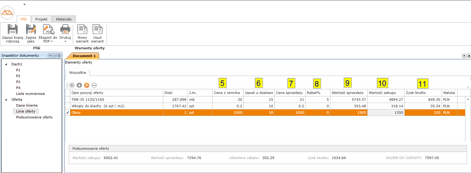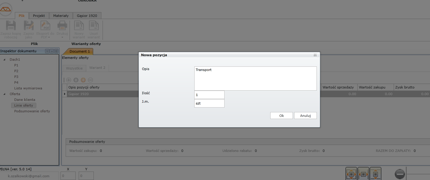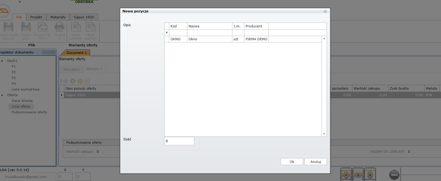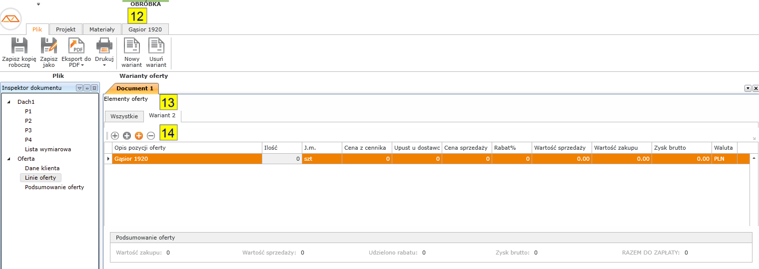 Na zakładce Linie oferty tworzymy warianty oferty oraz obliczamy wartość oferty.